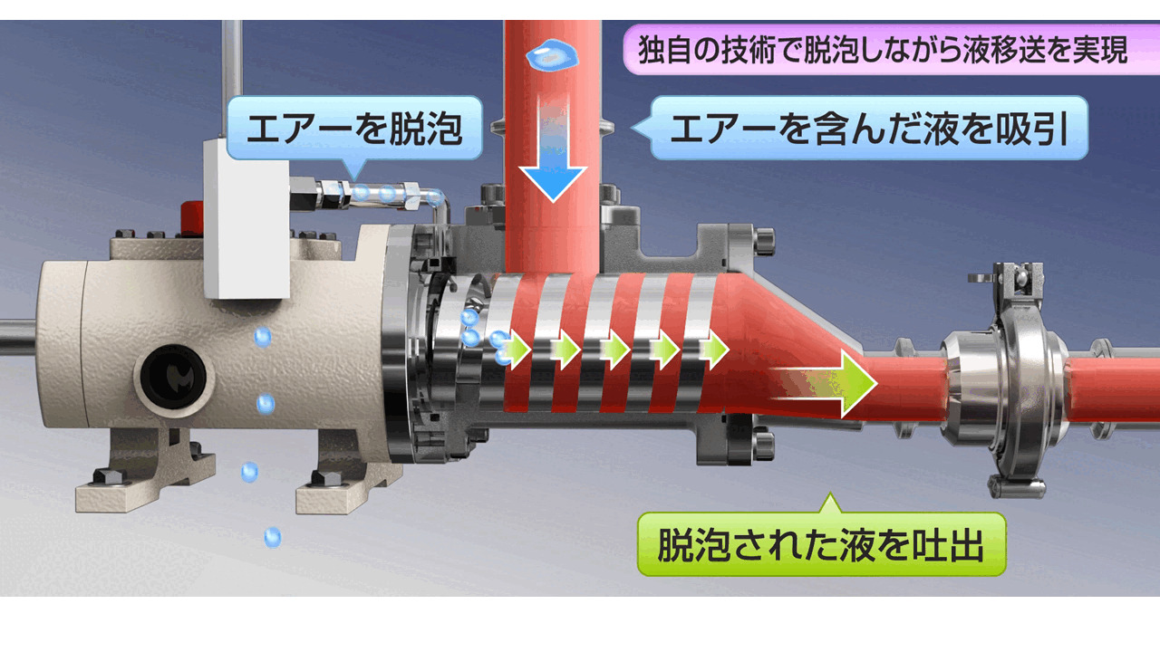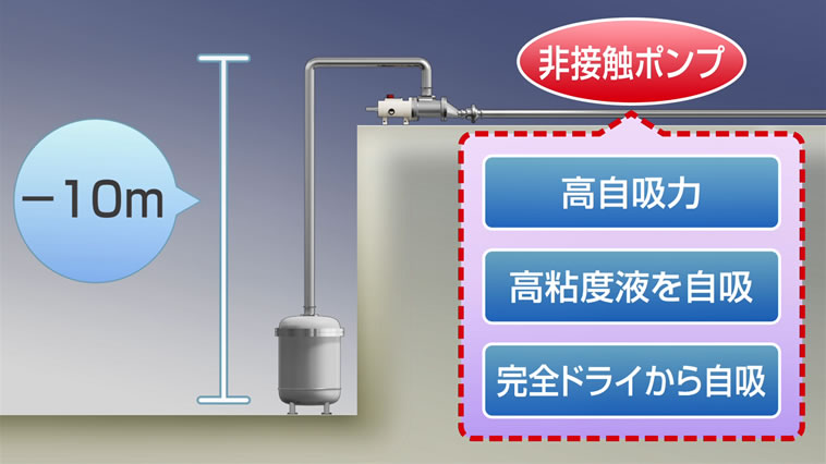 他にも真空ポンプ等の別機器で自吸力を発生させる機構の為、呼び水不要で非接触式ながら最高の自吸力を持ち、低流動性液や高粘度液でも安定して送液でき、ラインが止まる心配がありません。