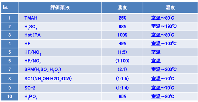 無機・有機各種の薬液における半導体プロセスに応じた薬液条件での評価が可能です。