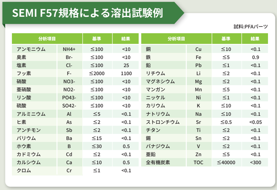 最新版SEMI F57-0622をはじめ、各種規格に準拠した、イオン・金属溶出試験やTOC(全有機体炭素)測定を実施いたします。