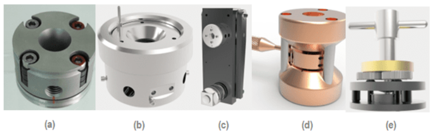 DACによって生成させる力は、さまざまなメカニズムによって生み出されます。ほとんどのDACは、ネジ駆動またはメンブレン駆動(それぞれ下図aおよびb)です。しかし、力を生成する方法は他にもあります。レバーアーム設計やターンバックル原理、またはギアボックスを使用してDACプレートを曲げる方法(それぞれ下図c、d、e)などです。