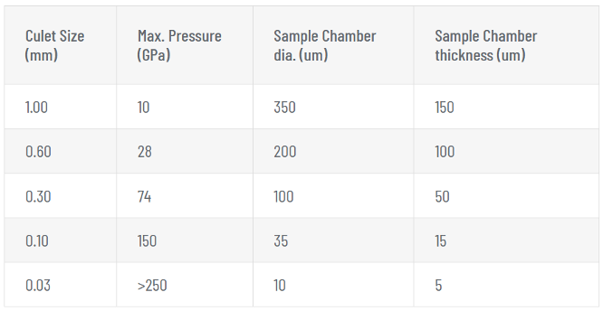 高圧実験で覚えておくべき重要なポイントは「圧力が高くなるほど、試料のサイズは小さくなる」ということです。以下の表は、ダイヤモンドカレットサイズと目標とする最大圧力に対する試料用チャンバーサイズの例を示しています。